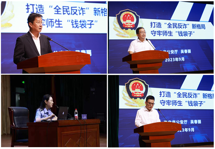 郭沙致词。他指出,电信网络诈骗形势严峻,受骗人群范围广,诈骗花样形式多,诈骗金额大,影响校园安全稳定。他强调,一是构建大宣传格局,警校银企联动开展反诈宣传,营造浓厚反诈防骗氛围。二是健全工作机制。形成“党政齐抓共管,师生全员参与,部门协作联动”的格局。三是构建网络体系。建立学校、院系、学生三级“反电诈”工作体系,全力推进反“电诈”工作落实落细。四是开展创优行动。要在师生中组织开展丰富多彩、富有成效的“反电诈”活动,评选反诈先进组织和先进个人。五是开展曝光行动。及时通报师生电信网络被骗案件,以案示警,持续提升师生员工的安全意识和反诈能力,有效遏制电诈案件高发势头。