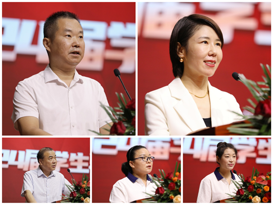 2024届优秀毕业生代表杨菊柳,优秀校友代表孝感市中心医院肾内科护士长、2002届毕业生杨霞,教师代表黄学先老师,2024届毕业生家长代表孝感市老年大学副校长连向东,学校合作企业代表北航天三江万峰科技发展有限公司人力资源部部长吕朝阳依次发言。