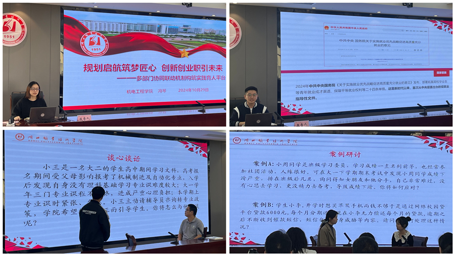 在思想引领环节,机电工程学院辅导员周鹤龄以“政策导航明方向,师生共筑梦飞翔”为题,运用详实数据和实例,从高校毕业生的就业形势分析、高校毕业生的就业政策解读、专科毕业生就业的常见渠道等方面,进行了深入细致的分析。