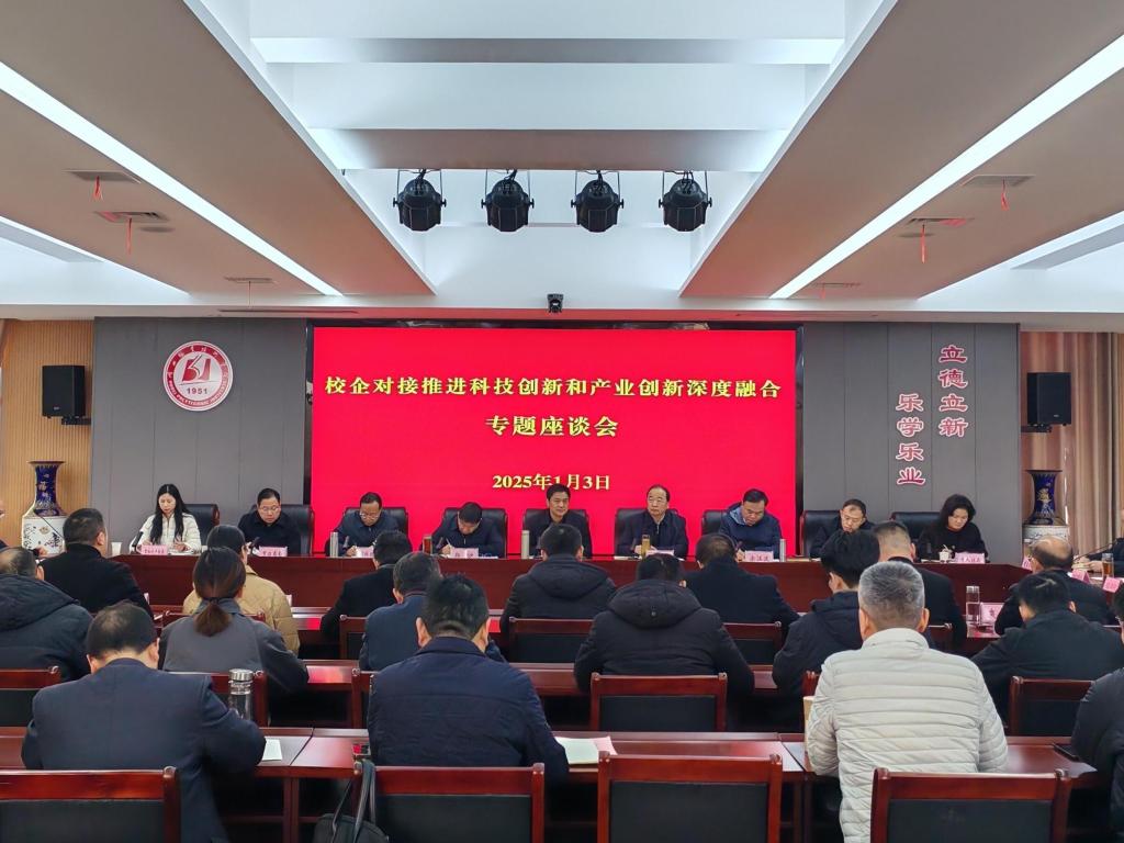 (本网讯 文/熊元焕 胡世港 图/陈灏)1月3日上午,孝感市委常委、统战部部长贺卫东来校调研,主持召开校企对接推进科技创新和产业创新深度融合调研座谈会。孝感市政府办公室副主任涂江波,市科技、招商、经信、人社、知识产权、工会等部门相关负责人,孝南区、孝昌县政府及市高新区管委会分管负责人,江北机械、险峰电子、大禹电气、米开罗那、精建宏新能源、恒安集团、爽露爽食品、海越(湖北)电气等企业负责人,校领导郭国文、郭沙、白梦清、胡昌杰及相关院部负责人参加座谈会。