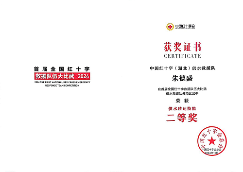 (本网讯 江璇)近日,首届全国中国红十字救援队伍大比武活动颁奖典礼举行,我校校园建设与后勤保障处员工朱德盛同志作为湖北供水救援队核心队员,凭借在云南昭通赛场上的卓越表现,以全国第二名的佳绩荣获“供水救援分项比武供水转运技能二等奖”。