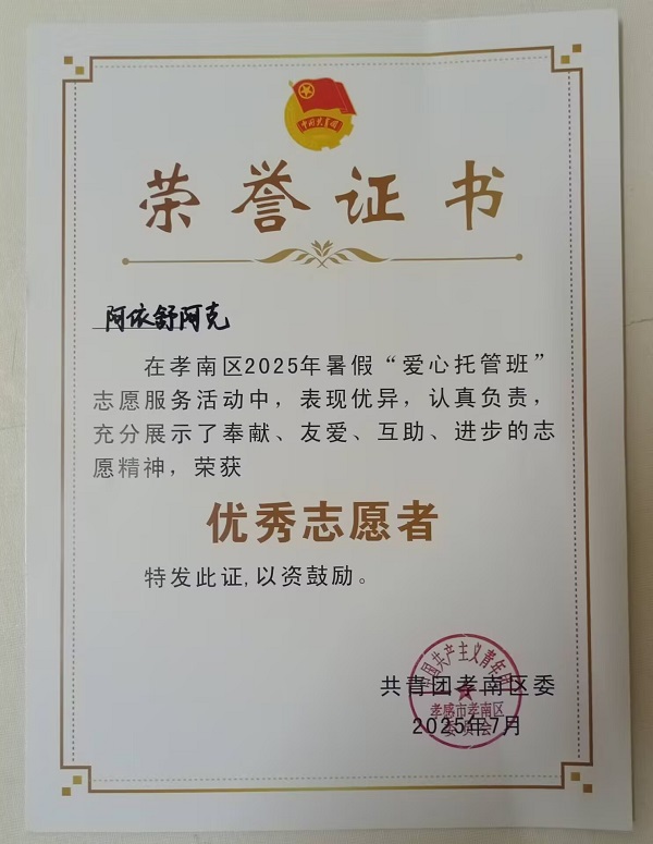 (2025年7月,阿依舒阿克被共青团孝南区委授予“优秀志愿者”称号)
