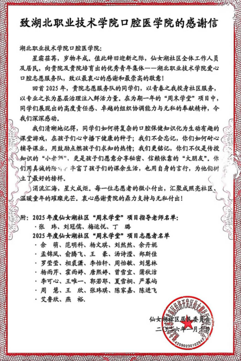 (本网讯 丁璐)1月10日上午,仙女湖社区在党群服务三楼大会议室举办“仙女湖社区2025年度志愿者表彰大会”,仙女湖社区党支部书记、居委会主任姚波、孝南区青年志愿者协会副会长王述惠、口腔医学院学工党支部书记、副院长张玮、口腔医学院爱心口腔志愿服务队及师生代表参加活动。