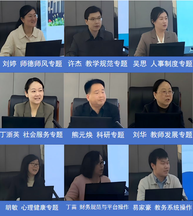 本次校本培训内容紧扣新入职教师识岗需求,围绕师德师风教育、教师教学规范、科研与社会服务、学生管理、智慧校园运用、学校制度、职业发展等专题展开。马克思主义学院刘婷老师以“涵养高尚师德师风 争做育人‘大先生’”为题开展专题讲座,引导新教师筑牢师德根基、坚守教育初心;教务处处长许杰以“扣好第一粒扣,上好第一堂课”为题,讲解教师教学行为规范与教学管理艺术;学工部胡敏老师带来“以心润心 护航成长”专题培训,助力新教师提升学生心理教育与辅导能力;人事处副处长吴思进行人事制度通识培训,帮助新进教师初步了解学校人事管理相关规定。继续教育学院院长丁浙英以“社会服务 职业院校教师发展的必经之路”为主题,鼓励新教师积极主动融入行业、服务地方;科研处副处长熊元焕作“潜心科研当先锋”专题分享,引导新进教师树立科研意识、找准科研方向;教务处易家豪老师、财务处丁苗老师、教师发展中心副主任张舟分别对学校教务管理系统、财务协同管理平台、“工学云”教师企业实践平台等进行讲解与演示。教师发展中心主任刘华围绕“高职教师发展与素质能力提升”,指导教师明晰职业发展目标和成长路径。