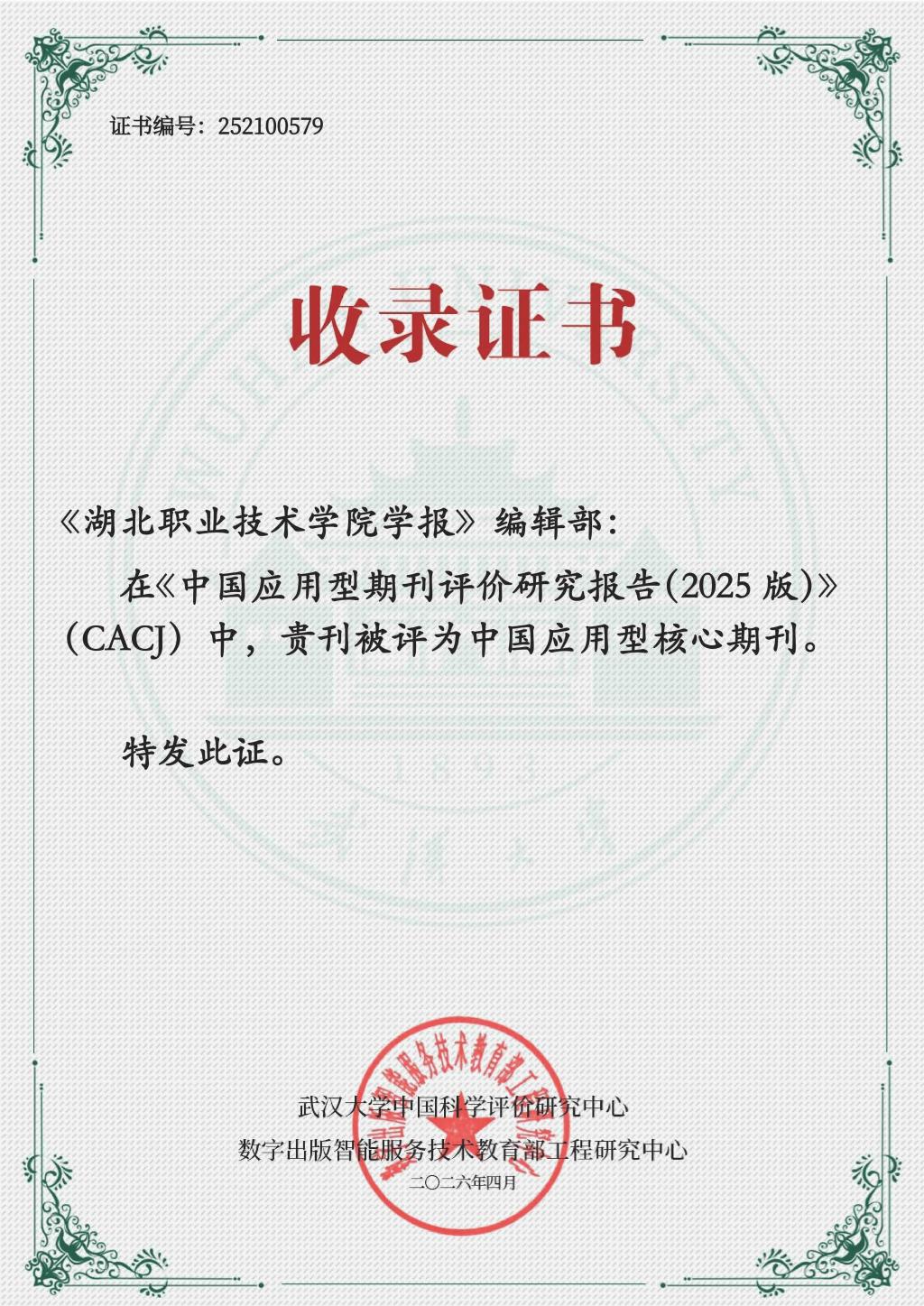 (本网讯 张玥 肖应勇)近日,在第二届应用型期刊高质量发展研讨会上正式发布的《中国应用型期刊评价研究报告(2025版)》中,《湖北职业技术学院学报》再次被评为“中国应用型核心期刊”。这一荣誉的取得,标志着我校学报办刊质量、学术影响力和应用价值获得权威评价机构认可,也为我校高质量发展增添了新的亮色。
