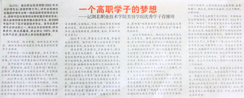 2010年9月,带着自己的梦想,带着对未来的憧憬,她不远千里从云南来到了湖北职业技术学院,成为美容学院的一名学生。