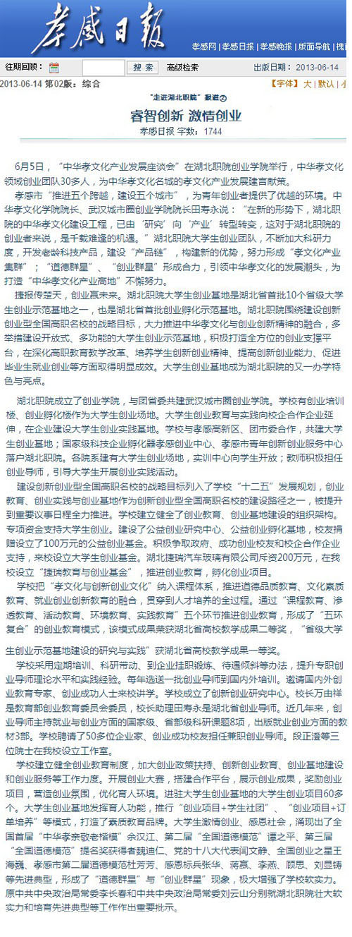 6月5日,“中华孝文化产业发展座谈会”在湖北职院创业学院举行,中华孝文化领域创业团队30多人,为中华孝文化名城的孝文化产业发展建言献策。