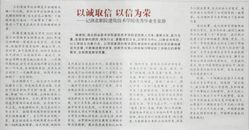 张静,一个刚踏出校园不久的建筑技术专业毕业生,然而,他坚持“诚实做人,诚信做事”的工作原则,在职场赢得了同事的认可和赞许,在平凡的工作岗位上做出了不平凡的事情。在我们中华民族走向伟大复兴的路途中,如果每个人都能在自己平凡的工作岗位上干出不平凡的业绩,中国梦的脚步会走得更加坚实,中国梦会离我们越来越近!