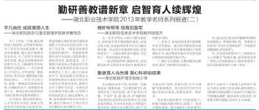 从一名专业带头人成长为教学副院长,如何提升青年教师整体素质,培育后备力量,是他始终思考并尽全力解决的问题。经过多年的摸索和实践,胡昌杰培育了一大批优秀的青年教师,并总结了一些好的做法和经验。一、通过常规管理、跟踪培养、定向辅导的形式规范并养成青年教师良好的教学习惯。例如:在2009年,他连续三次听青年教师胡世港讲课,与他共同研讨设计“JAVA软件开发”课程的情境化教学,真正提高专了业教师基于工作过程导向的教学设计及实施能力,有力地提高了胡世港的教学能力;二、多形式、多途径促进青年教师教学水平的提高。通过组织教师参加课程开发培训提升青年教师课程开发的理论水平;通过开展“说课”培训促进教师钻研教材、夯实教学基本功、创新教学方法的动力;通过聘请专家作学术报告提升教师的实践教学能力等;三、整合企业资源,为教师提高免费培训,提升了教师的专业能力;四、通过项目建设培养锻炼青年教师的业务能力。带领胡世港、陈焜等教师共同研发“学校日志管理系统”、 “学校教学质量保障与评价系统”;指导李岚、赵荣等教师建设《计算机网络技术专业》;五、通过指导比赛提升青年教师的专业技能。在他及团队的共同努力下,“网络优化与三网融合”技能比赛获国家级团体二等奖(高职组)、《平面图像设计》课件荣获第十届全国多媒体课件大赛三等奖。