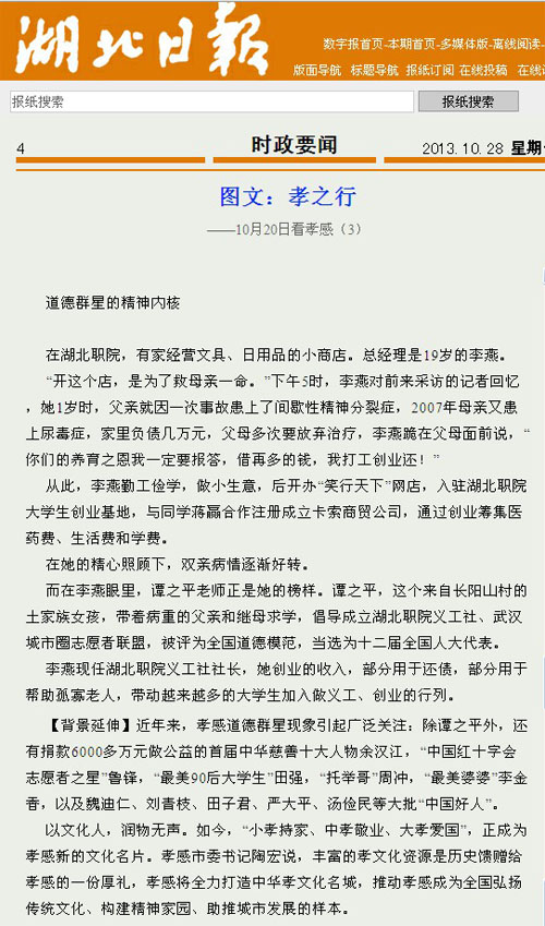 10月28日,湖北日报“孝之行——10月20日看孝感”专题报道中,以我校学生李燕的先进事迹,深刻诠释了道德群星的精神内涵。特转载如下: