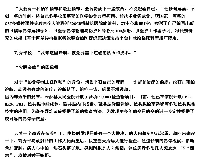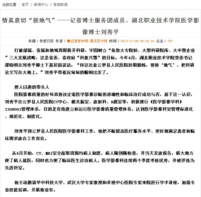 近日,孝感日报报道了省博士服务团成员、湖北职业技术学院医学影像博士刘秀平在云梦县人民医院挂职锻炼期间先进事迹。特转载如下: